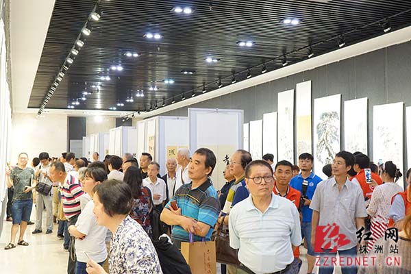 “忠孝荷塘”荷塘区首届书法、美术作品展现场,市民正在观摩参展作品。