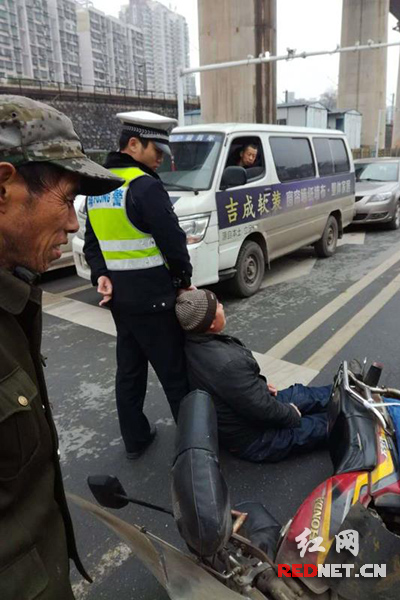 红网时刻株洲1月24日讯(通讯员 张雅君 记者 龙琦)1月23日上午,株洲街头出现了这样温暖的一幕:摩托车驾驶员受伤倒地,不能站立,赶来的交警以脚为坐垫、以腿为靠椅,让伤者依靠,并保持这个姿势近半个小时。