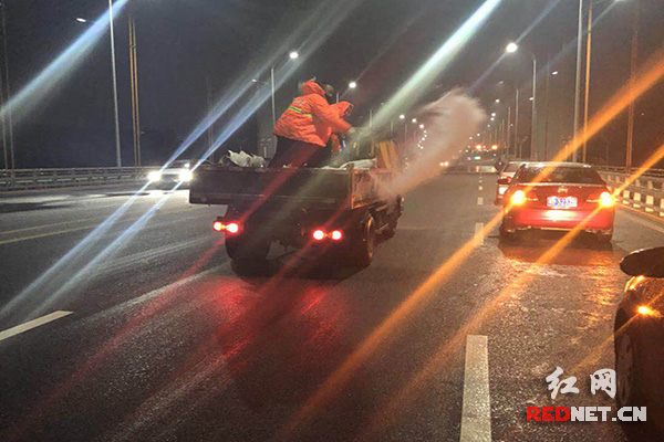 今冬初雪于今日凌晨“赶到”株洲,早上四点,市政工程维护处应急队员紧急出动,开始进行撒盐除冰工作。