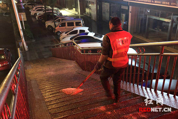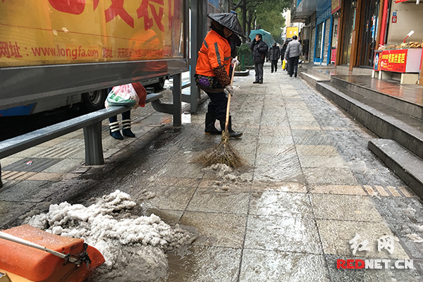 这么冷的天,出门都要做心理斗争,株洲环卫工人却迎“雪”而上。(曹缇 摄)