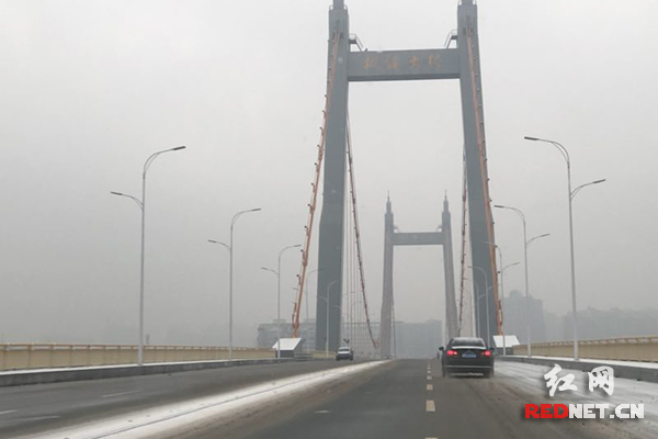 被初雪覆盖的株洲枫溪大桥,经过除雪工作,不少路面已开始“露脸”。(任欣蓓 摄)
