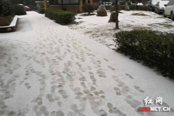 初雪来临,小区地面上白皑皑一片,路过的人们留下了匆忙的脚印。(钟娉 摄)
