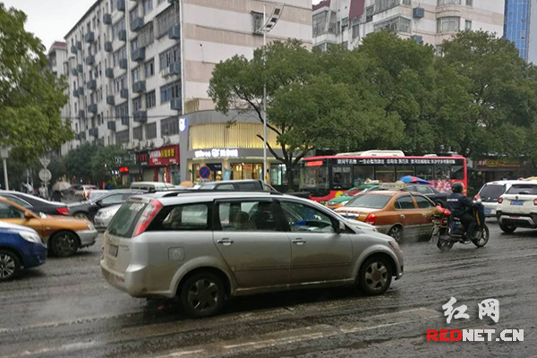 初雪落在马路上容易发生打滑,为安全出行,株洲司机们开车都放慢了速度。(龙琦 摄)