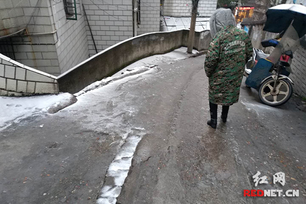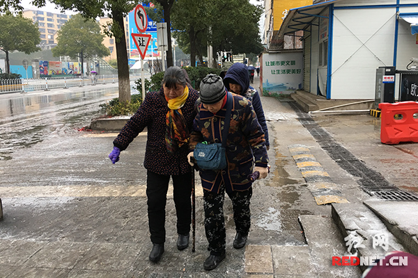 为了防止摔跤,两位老人相互搀扶着,小心翼翼地走路。提醒各位老年朋友,为了自身安全,冰冻天气尽量不要出门。(曹缇 摄)