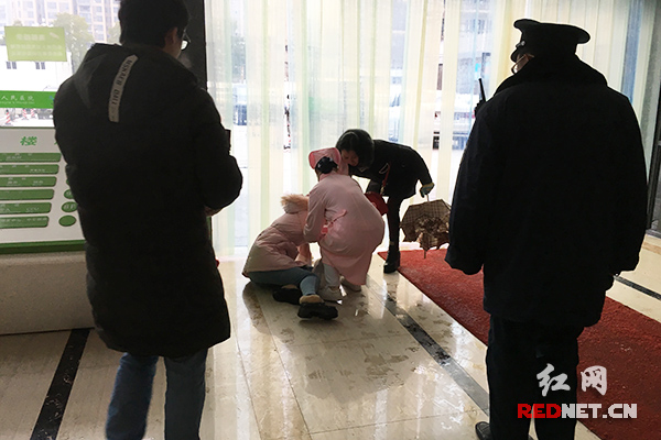 受湿滑地面的影响,一位市民在医院门口摔了一跤,热心市民和医院护士、保安赶紧上前扶了一把。