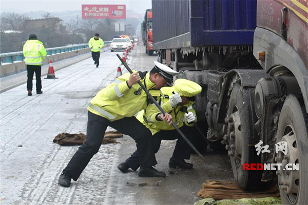 1月28日,京港澳高速株洲段马家河大桥因桥面出现结冰导致大型车辆无法通行,高速交警立即协同联动单位一同开展破冰工作,通过钢钎破冰、铁锹铲冰、撒融雪剂、铺设麻袋等方式帮助大型车辆通过桥梁。