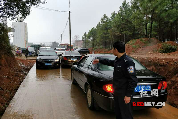 在莲塘坳中学执行护学岗任务的民警肖国亮及时进入到车辆和人群中间,对现场交通进行疏导。