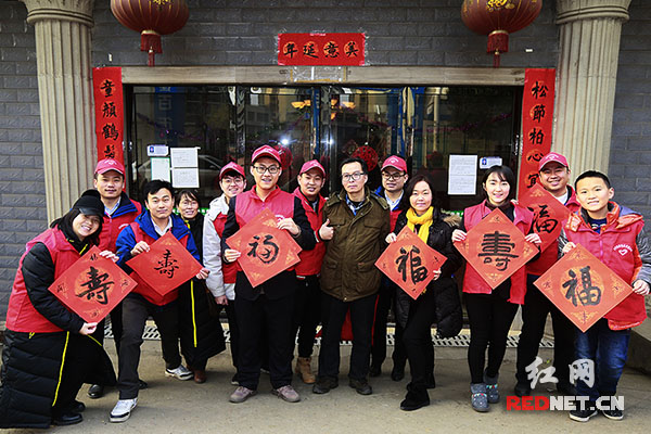 在郭殿儒的房间,志愿者们送上一幅老人满意的春联,上联是“壮志未与年同老”,下联是“白髪银髯再生辉”,横批是“美意延年”,郭殿儒好生喜欢。据介绍,中车株洲电机志愿者共计为收住在华康老年公寓的40位孤寡老人都送上了一幅自己喜欢的春联,把老年公寓扮靓得红红火火,帮助他们喜迎新年。