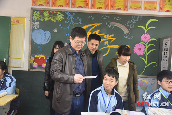 天元区教育局局长唐厚睦走进教室查看学生的缴费单