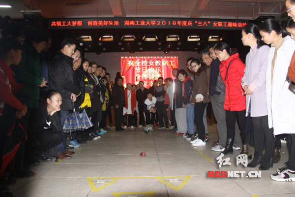 红网时刻株洲3月8日讯(通讯员 曹荣芳)为迎接第108个“三八”国际劳动妇女节的到来,3月6日下午,湖南工业大学工会庆“三八”女教职工趣味运动会顺利举办。运动会设赶小猪和沙包掷准两个项目,吸引了该校25个分工会400余名教职工前来共享运动快乐。平日里不辞辛劳紧张工作的女教职工们轻装投入,整个活动现场气氛空前活泼。