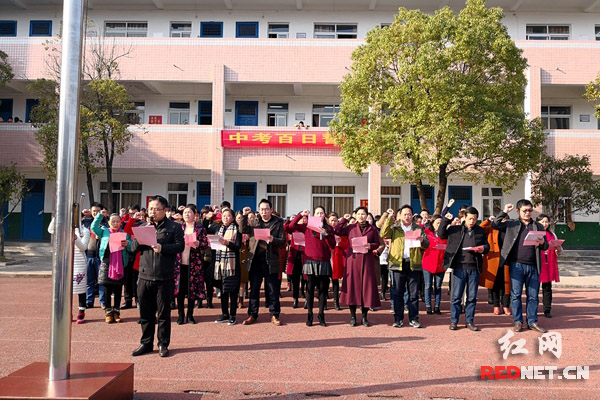 全体初二、初三老师,行政领导在国旗下庄严承:最后一百天,全体教师必将兢兢业业、艰苦奋战,帮助每一个孩子,关爱每一个孩子,成就每一个孩子,圆梦每一个孩子。在最后一百天,要用挚爱关注每一位学子,用智慧迎接每一次挑战,用鼓励坚定每一个进步,用奉献影响每一个人生,用拼搏创造每一个辉煌。