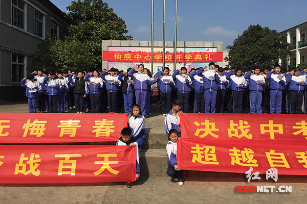 红网时刻株洲3月9日讯(通讯员 肖雅珏)厉兵秣马,六月出征, 2018年备战的号角已响彻云霄。今天,株洲市仙庾中心学校举行中考百日誓师大会,激发学生的拼搏精神,增强迎战中考的信心和决心。