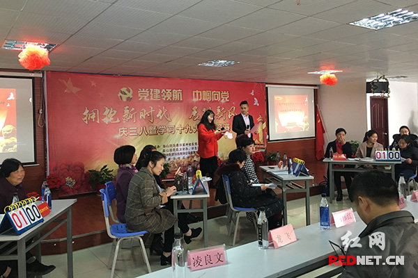 3月8日,株洲市天元区泰山路街道徐家冲社区举办了党的十九大精神知识竞赛活动。竞赛现场,五支代表队15名代表你追我赶,竞争十分激烈。题目设计涵盖了党的十九大精神、新修订的党章、党规党纪、廉政知识等内容。参加竞赛的人员有社区党员和群众,年龄最大的是70多岁的王水清,她是社区的妇女队长,她说:“‘幸福都是奋斗出来的’,我用习近平总书记的这句话教育我的儿孙们,没想到平时社区干部、邻里之间谈论的话题在这次比赛的时候还用上了。”