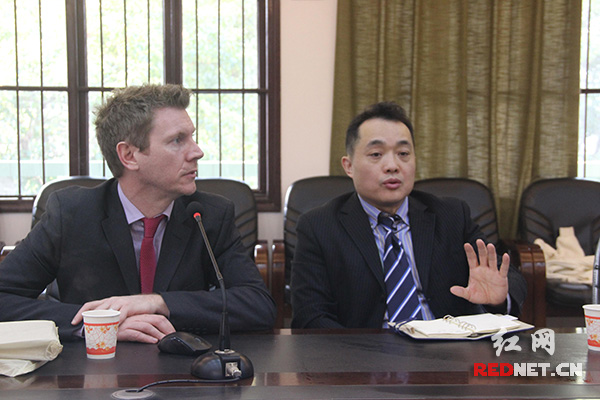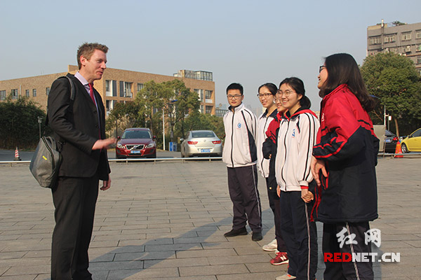 高二学生廖湘莲落落大方地向Kieran和曲波介绍株洲市十三中的发展历程、办学理念和国际化合作的经验,赢得了一致称赞。Kieran也详尽地介绍了高尔中学的概况,表达了合作的意愿。
