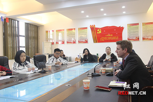红网时刻株洲3月14日讯(通讯员 曾锐文 摄影 谭思佳)3月12日上午,英国高尔中学国际交流处主任Kieran以及高尔中学中国办公室主任曲波一行来到株洲市十三中进行访问交流。学校英语兴趣社的同学们全程安排接待陪同,展现了株洲市十三中学生优良的素质。