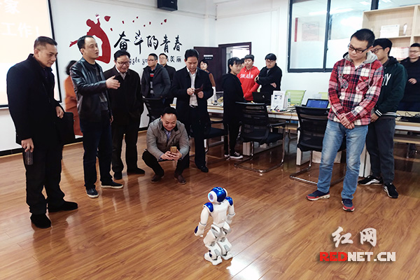 委员们参观了湖南工业大学及计算机学院创新创业教育中心。在现场,机器人创新组进行了机器人表演展示,伴随着“小苹果”音乐的响起,小机器人舞动着身子和手臂,跟着音乐节奏,欢快地跳起了广场舞,引得委员们不停发出赞叹声。