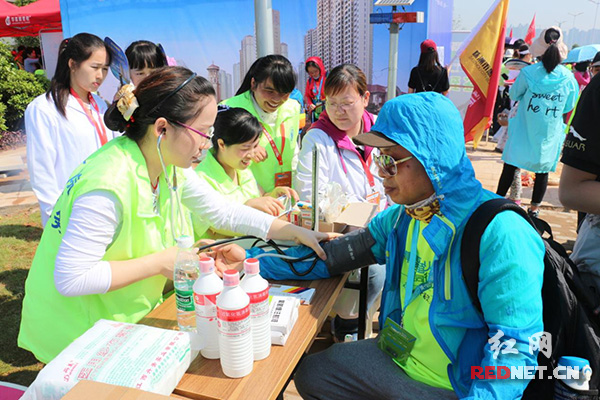 就在这一天,有这样一支队伍,他们的闹钟在凌晨4点半准时响起。穿衣、洗漱,集合、乘车,一切井然有序。他们是由株洲恺德医院的医护人员组建的一支“湘江毅行医疗保障队”。一辆救护车、若干医护人员、上百件药品组成最强医疗保障团队。