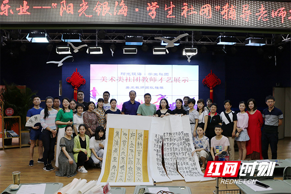 黎薇老师带的一年级表演唱社团孩子们初登舞台,有模有样,声音清越,希望冉冉!周卉、唐颖两位老师随乐起舞,好一段双人舞啊,令人不仅击节赞叹:“学校有这等妙人,家中有这般美人儿啊!”向望老师在周雨露老师制作的初页作品中登场,篮球在他的掌中飞旋;科学社团王绍华老师则给大家一个小探究“一根铁丝的创意方式”,创新思维确实是我们都需要的;周志伟、许春耕、黄郴等美术老师带来了自己的书法美术作品,画卷展开,气势蓬勃,精美绝伦。最后美术组还来了一次现场作画,年轻教师美滋滋地说:“太好了,得以现场直观学习,实在收获多多。”一时间,多才多艺的社团辅导老师们的风采,刷爆了学校微信和教师QQ群。