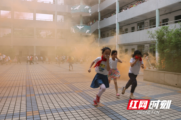 随着一阵刺耳的消防警报声响起,教学楼内浓烟四起,应急疏散指引老师立即到达指定岗位,引导楼道内学生快速疏散。各班老师也迅速地引导教室内学生快速疏散。老师们带领学生弯下腰、低下身子,用手、衣袖等捂住口鼻,沿着学校熟悉的疏散通道快速前进,有序撤离到操场的空旷地带,随即教师清点人数,并层层向上汇报,全校师生全部安全疏散完毕,整个逃生过程迅速而有序,用时4分42秒。