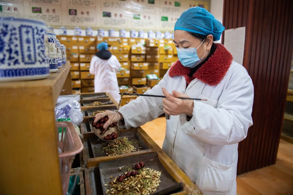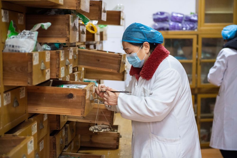 ↑3月4日,在株洲市渌口区中医医院中药房,中药师在记录中药发放台账。