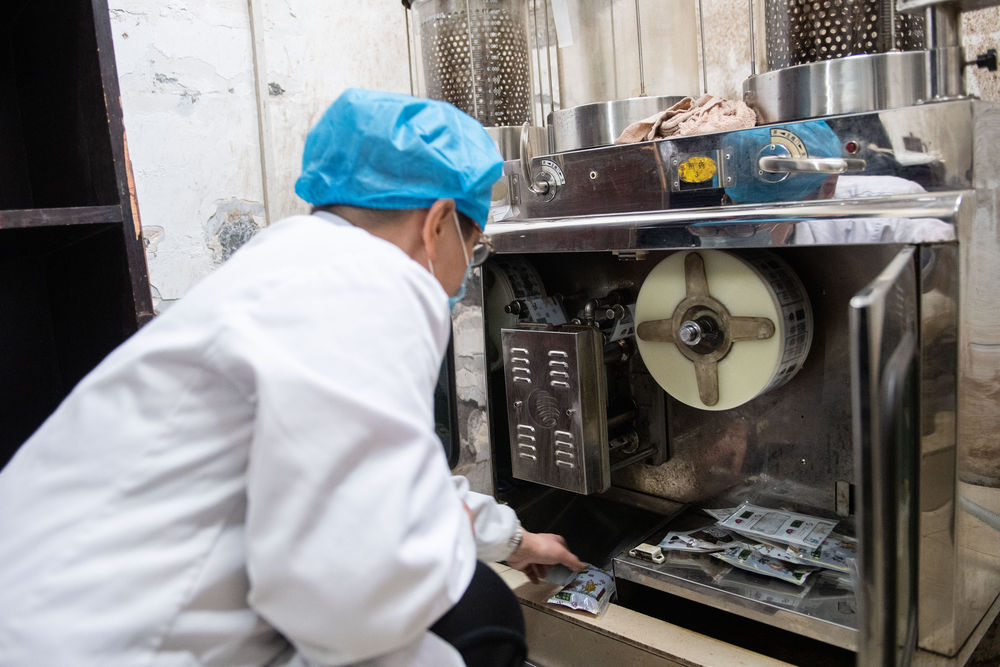 ↑3月4日,在株洲市渌口区中医医院煎药室,中药师在拾取自动包装好的中药。
