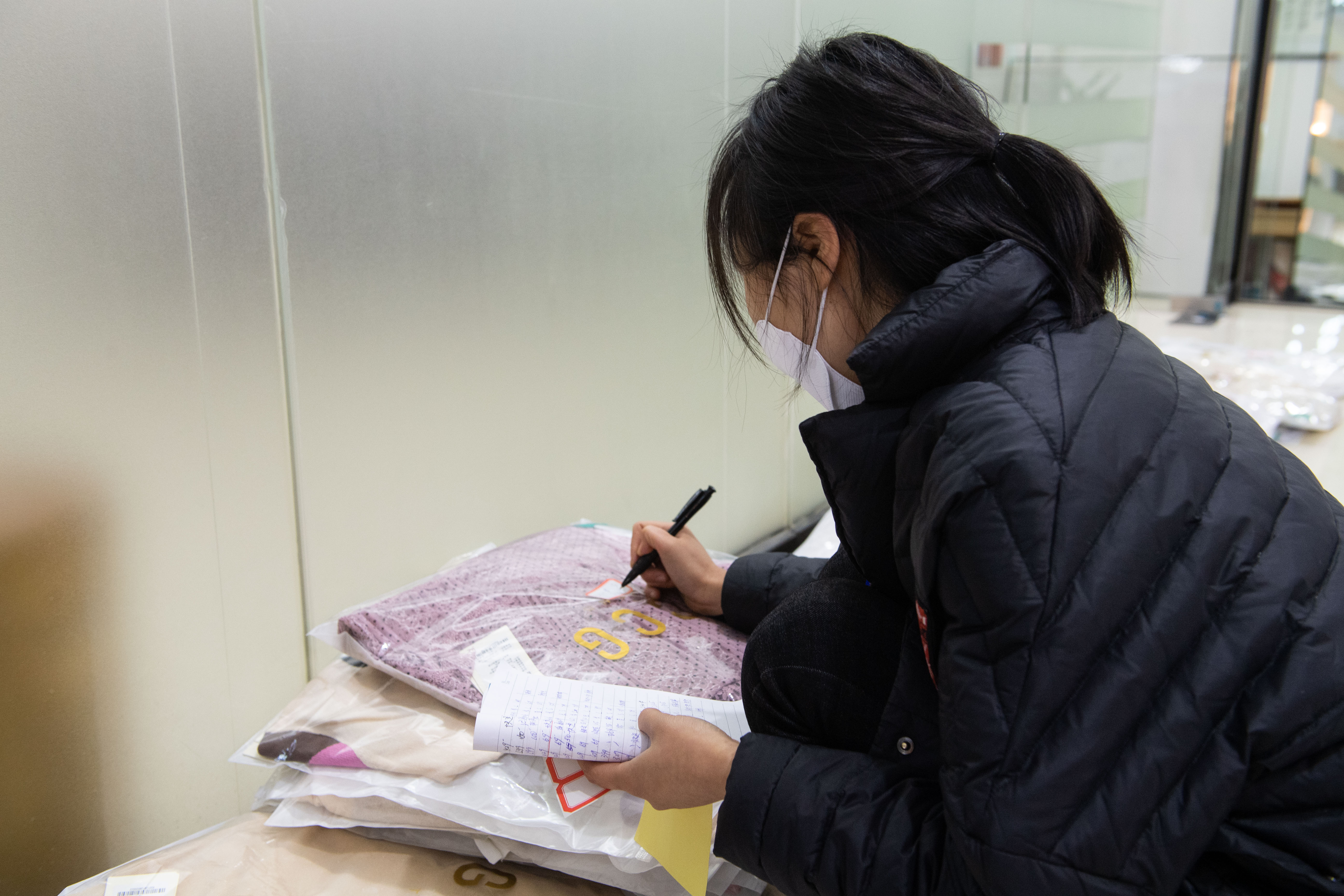 3月2日,芦淞金轮国际服装市场的商户给线上售出的商品做标记。