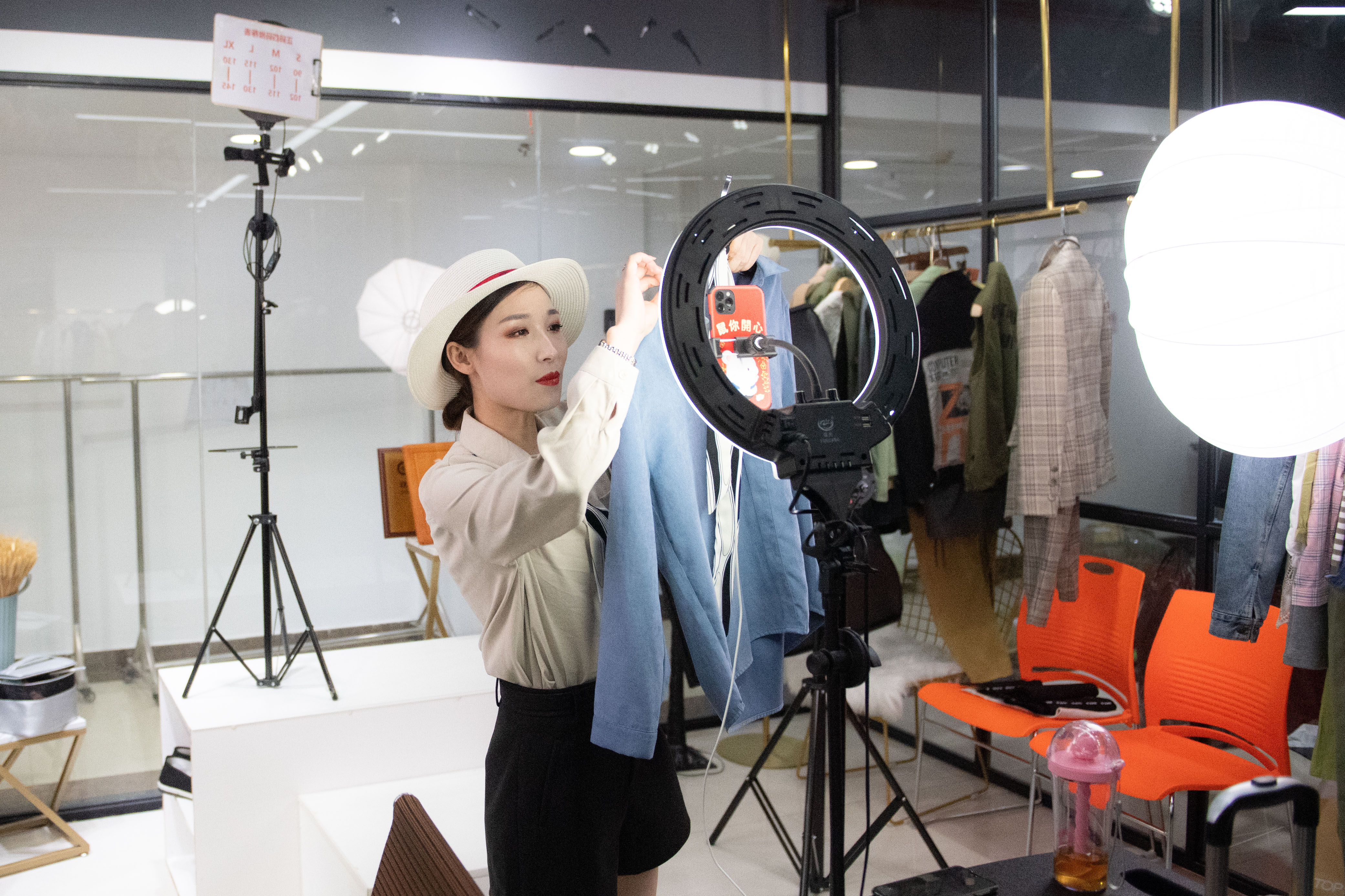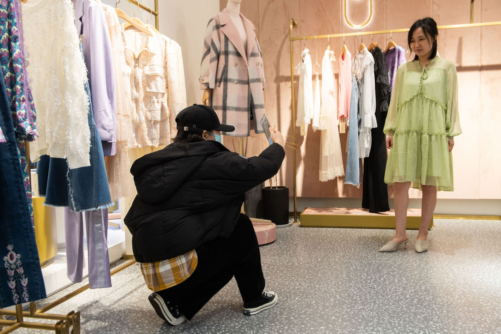3月2日,商户聘请的模特在芦淞欧洲城服饰市场直播,展示商品细节。