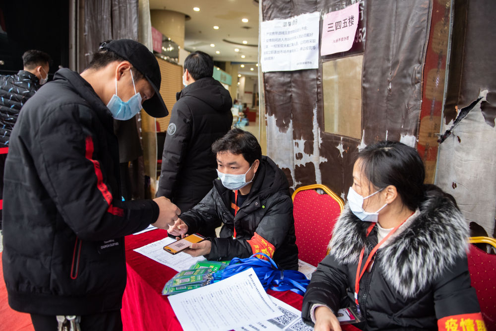 3月2日,在芦淞金轮国际服装市场门口,工作人员为进入市场的人员登记信息。
