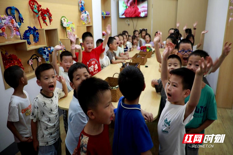 渌口区明德小学的学生在校内非遗劳动实践基地学习扎染、布艺、制扇、拓印等手艺。
