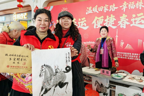 2026年春运期间,株洲火车站内暖意涌动,处处洋溢着温馨的氛围。为了让返乡游子们能在归乡途中感受到家的温暖,株洲市委宣传部等多部门联合举办“株事有礼·温暖回家路 幸福株洲年”活动。数位知名书法家和画家齐聚于此,他们饱含热情地现场挥毫泼墨,一幅幅精美的画作和一副副寓意吉祥的春联在他们的笔下诞生,随后被赠送给过往的旅客。