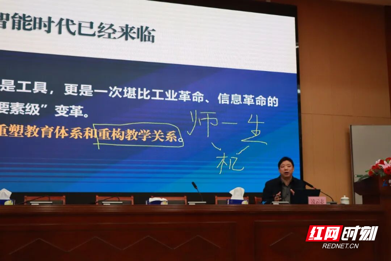 凌云志现场用AI工具制作“我与株洲炎帝古今对话”短视频,几分钟的操作让跨越千年的趣味互动跃然屏上,瞬间点燃全场,让老师们直观感受到AI打破时空界限的创意魔力。他深刻剖析了AI时代的教育新范式,指出教育已从传统的“师-生”二元结构升级为“师-生-机”三元主体关系,智能体正成为深度参与教学全过程的第三主体。他详细解读了教师生成式人工智能应用指引,明确“愿用、会用、善用”的指导思想,覆盖助学、助教、助育、助评、助管、助研六大场景,并强调教师要做AI的抉择者,而非服从者。