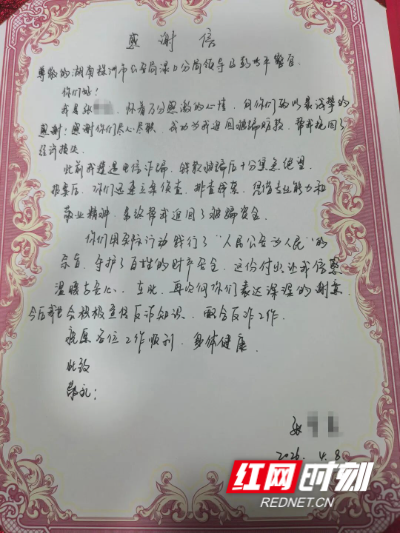 红网时刻新闻4月12日讯(通讯员 佘婷婷)近日,株洲市渌口公安分局渌口派出所的民警们收到了一封特殊的礼物——一封来自江西群众张女士的手写感谢信。信中字字恳切,“你们用实际行动践行了‘人民公安为人民’的宗旨,守护了百姓的财产安全,这份付出让我倍感温暖与安心”,简单的话语里,满是群众对民警的感激与信赖,也揭开了一场跨越数百公里的追赃挽损之战。
