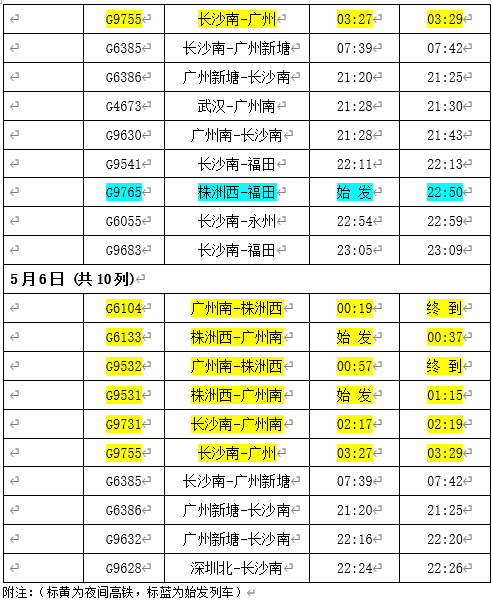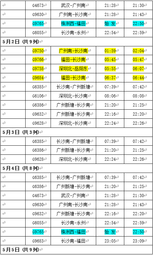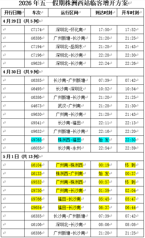 今年五一假期出行总量大,客流成分以中长途旅游客流为主,探亲流为辅。假日前期客流流向以广州、深圳、长沙等大城市为中心向周边省份及城镇辐射,后期以返程客流为主。前期集中出行上升较快,后期分散返程较为平缓。为更好满足旅客多样化出行需求,株洲西站提前开展客流分析研判,将通过加开热门线路列车、重联运行、增开夜间高铁等方式,加大运力投放,日均安排开行列车135列,确保旅客假期出行顺畅有序。其中,在二季度运行图基础上,采取“一日一图”,动态调整列车开行计划,8天运输期限内,株洲西站计划加开动车组列车66趟,包含17趟夜间高铁,7趟始发列车,具体增开车次,时间,区间如下: