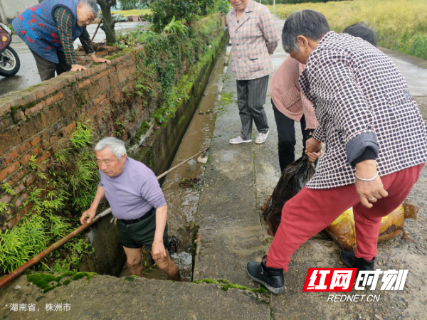 雨中清理并不轻松,渠水混浊,杂物缠绕。张建勤一边用竹竿探底,一边用勾耙一点点捞起枯枝和淤泥。一次次弯腰打捞,反复探底疏通,渠道终于恢复通畅,积水能够排出。