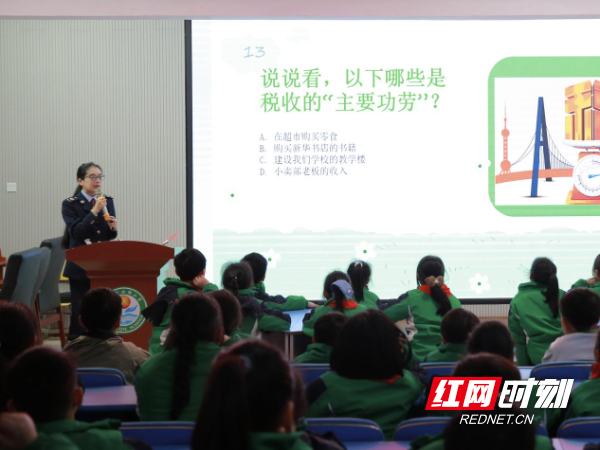 课堂里,亮起一盏“法”的明灯。“同学们,你们知道学校门口的道路,公园里的休息设施,是怎么建起来的吗?”在“税法小课堂”环节,税务青年干部化身“税法老师”,用动画短片、生活实例和生动比喻,将税收取之于民、用之于民的深刻内涵娓娓道来,孩子们听得津津有味,纷纷举手抢答,教室里笑声与掌声交织,依法纳税、诚信守法的意识在轻松愉悦的氛围中悄然生根,法治的明灯在孩子们心中点亮。