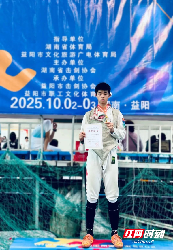 在2025年湖南省击剑冠军赛场上,景弘中学初二年级2408班赵梓淳同学表现抢眼。他在U14组个人赛中勇夺湖南省冠军,并与队友协力夺得所在U14组男子花剑团体第二名。在跨组别比赛中,赵梓淳不畏强手,夺得U16男子花剑个人湖南省第二名,展现出卓越的竞技水平和心理素质。