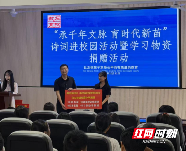 观课堂传文脉,捐物资暖童心。培训首站落子左权镇仙霞中学,“诗词进校园”帮扶活动成为现场观摩核心亮点。活动中,2022届湖南省选调生、左权镇副镇长龚周闯宇结合北大学习经历,分享励志故事,用真实人生轨迹激励学生直面挑战;醴陵市诗词协会会长刘铭讲授对联知识,以趣味互动点燃学生对传统文化的热情。课堂上问答声、掌声此起彼伏。活动现场,醴陵市委组织部与株洲市选调生教育帮扶联合会还向学校捐赠书架、体育器材、课外书籍等助学物资。选调生们表示,此次观摩不仅学到了帮扶实践经验,更坚定了助力基层教育的初心。