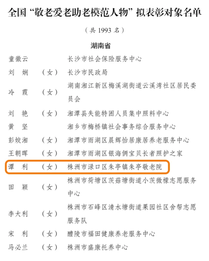 谭利自2004年担任朱亭敬老院院长以来,扎根基层养老服务事业21年,荣获“株洲市最美养老院长”“敬业奉献类株洲好人”“株洲市金牌护理员”等荣誉称号。
