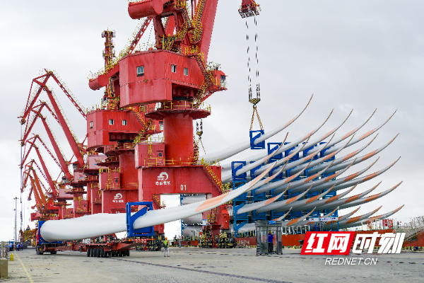 株洲时代新材料科技股份有限公司的风电叶片产品在射阳港装船,即将发往海外。