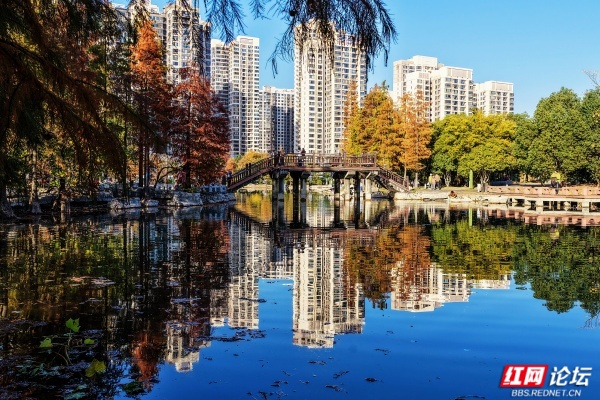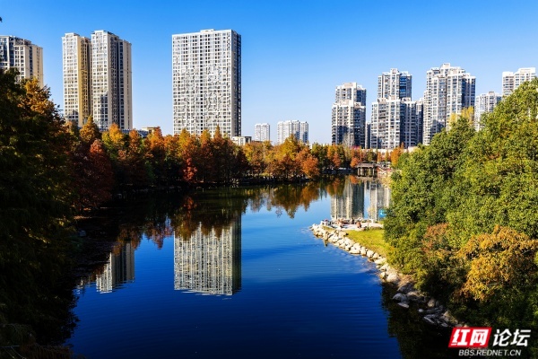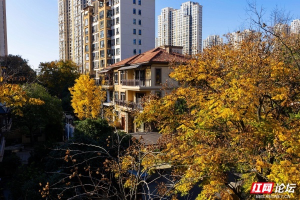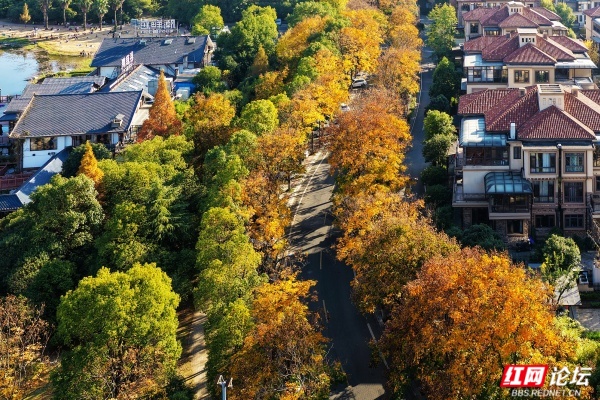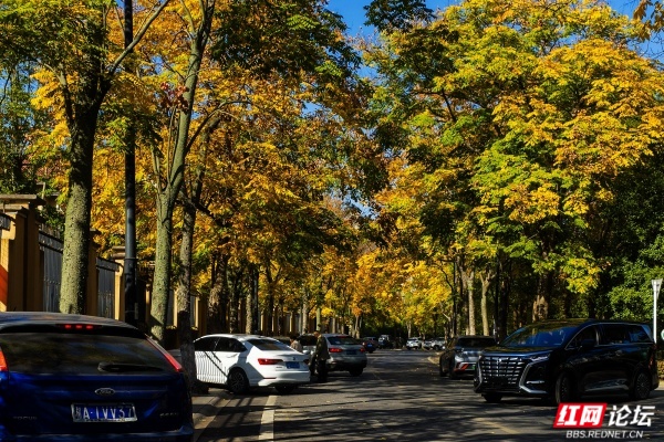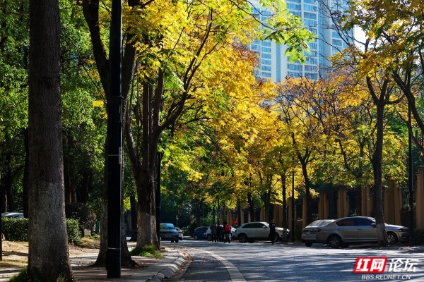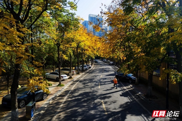 近日,株洲市天元区栗雨湖如同一幅色彩斑斓的画卷。道路两旁,树木的叶子换上了金黄与橙红的盛装,阳光透过枝叶洒下,为街道铺上一层温暖的光影。