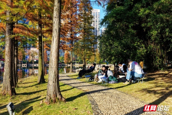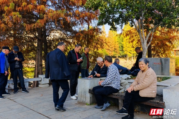 栗雨湖的秋日不仅有美景,更有人情味。老人们在湖边悠闲地聊天、休憩,年轻人则在草地上享受着秋日的阳光,一派祥和的景象。